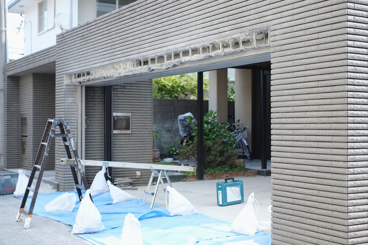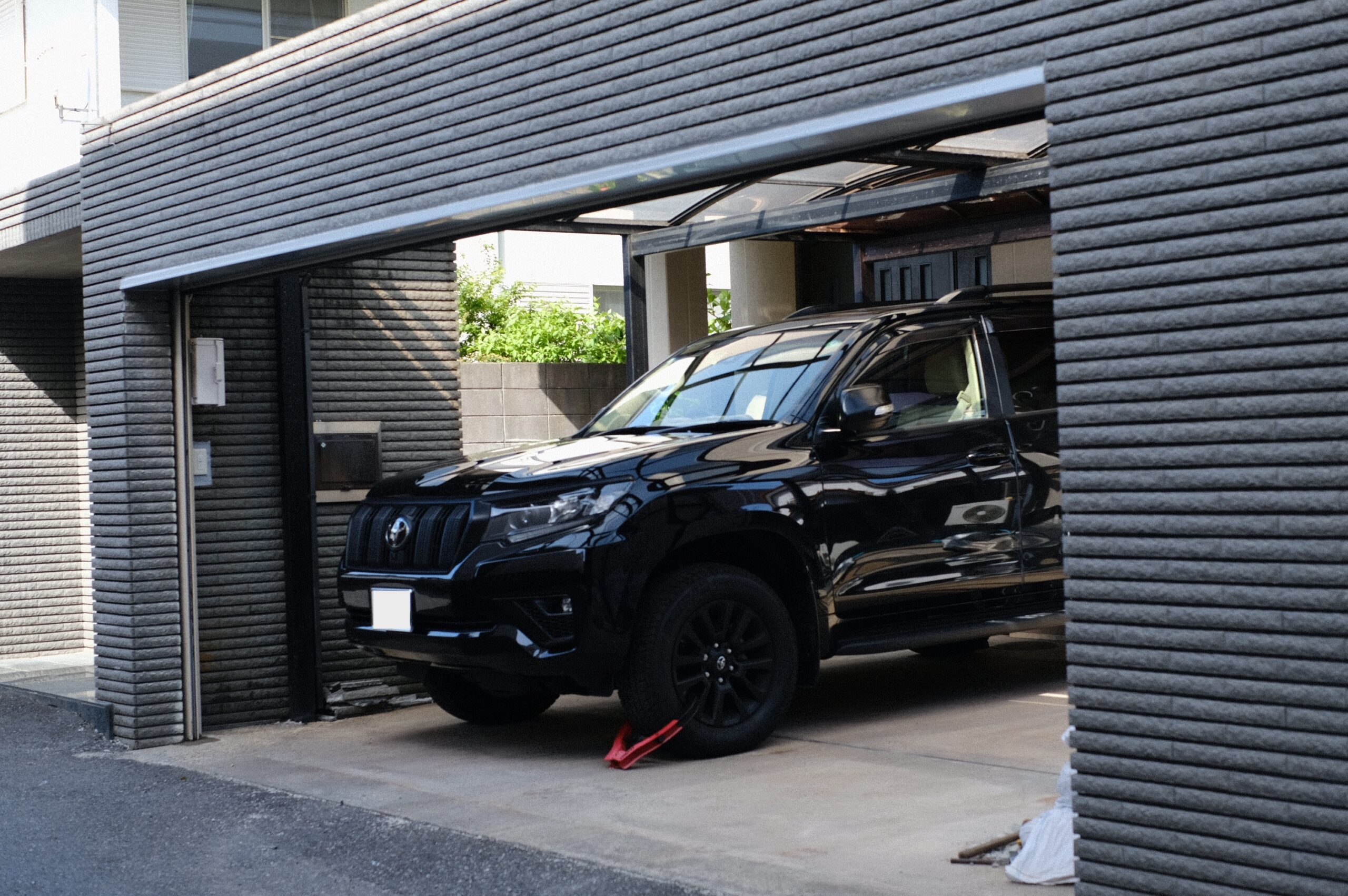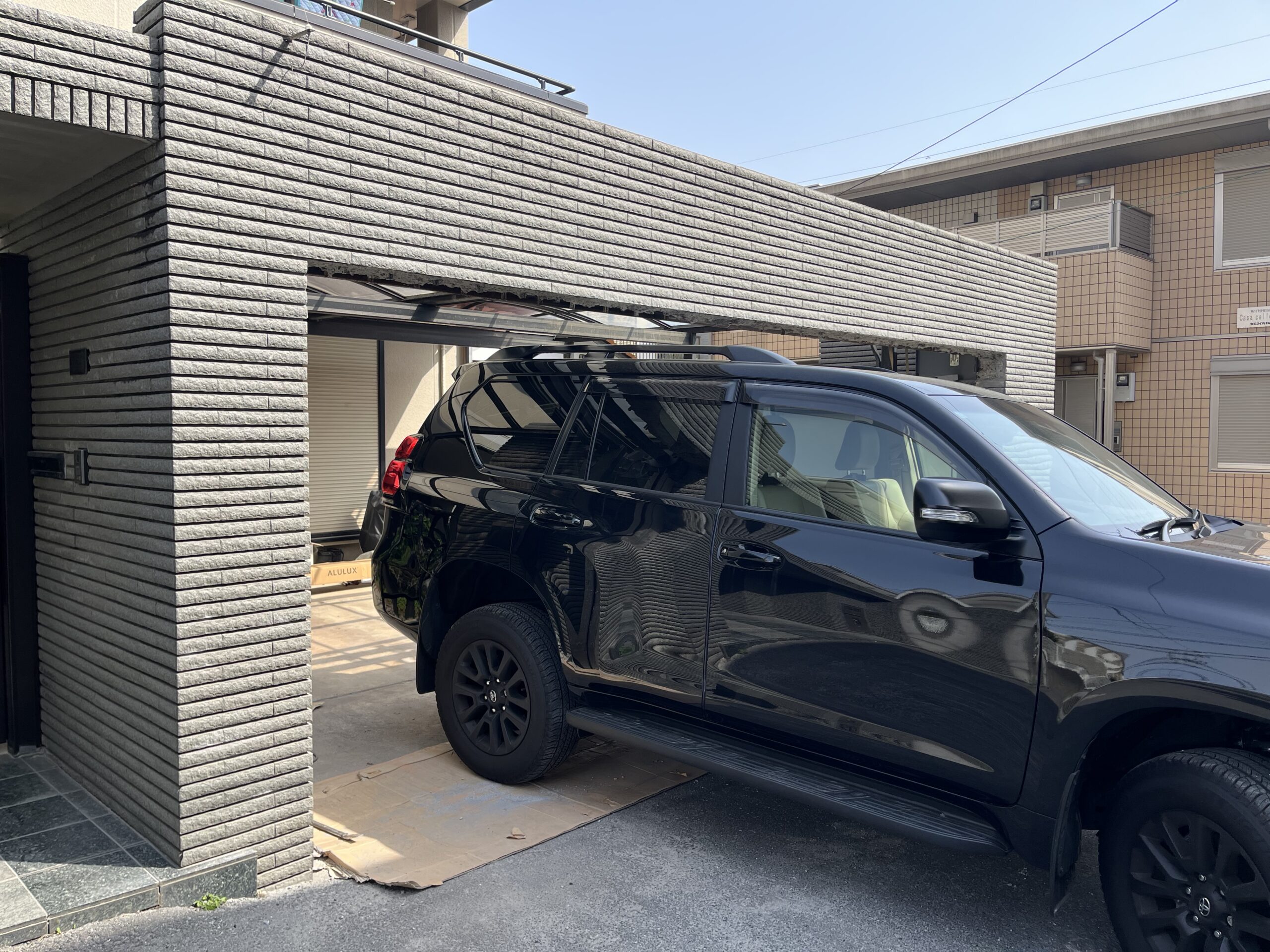 新車購入に伴い、既存アルミシャッターの高さと、タイルコンクリートの門柱の高さを上げないとガレージ内に入れないとのことで、タイルコンクリの削りを敢行し、車の出入り可能に致しました。